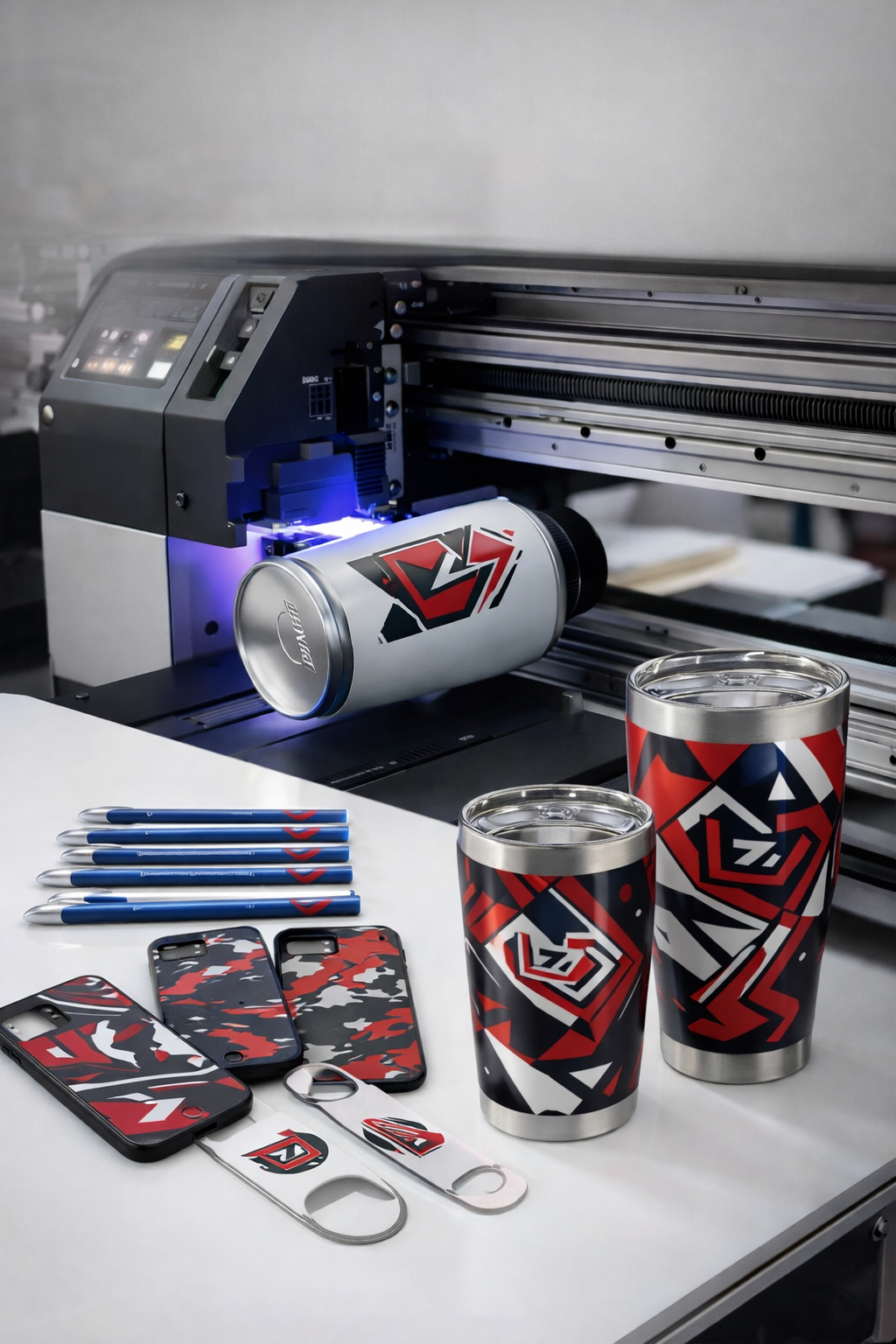 - Full color UV Printing, print logos and designs directly onto cups, tumblers, badges, pens and more.