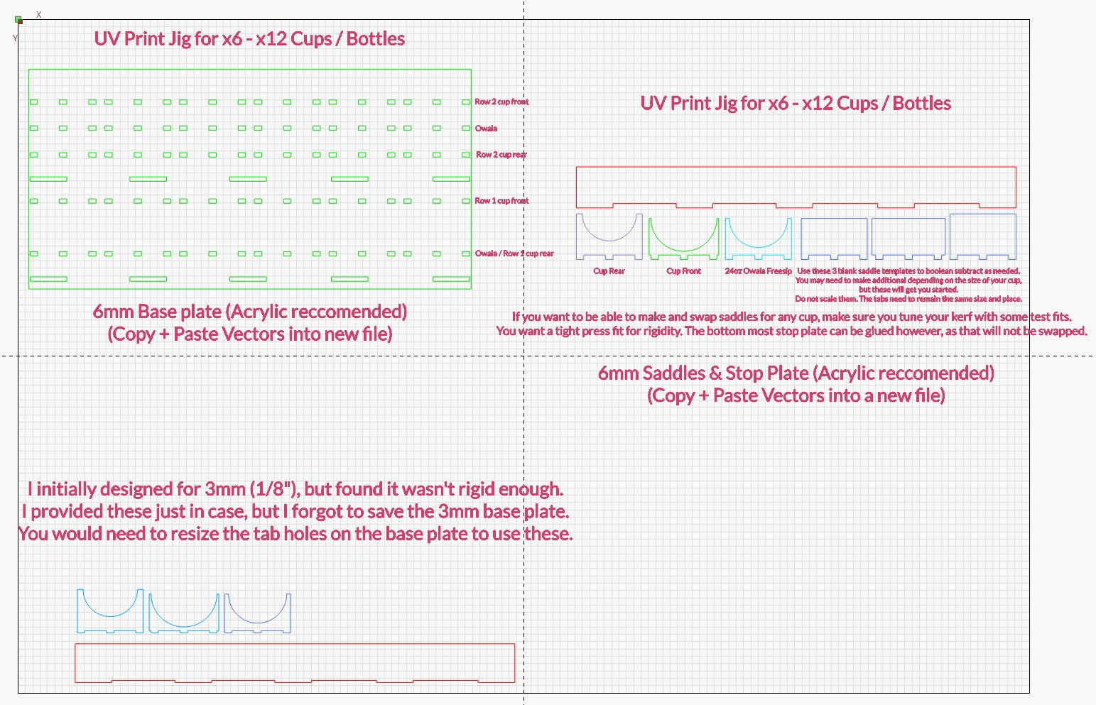 This design was created as a modular jig system with interchangeable saddles. 6mm acrylic is recommended for rigidity and repeatability, though users may adapt materials based on their workflow and preferences.